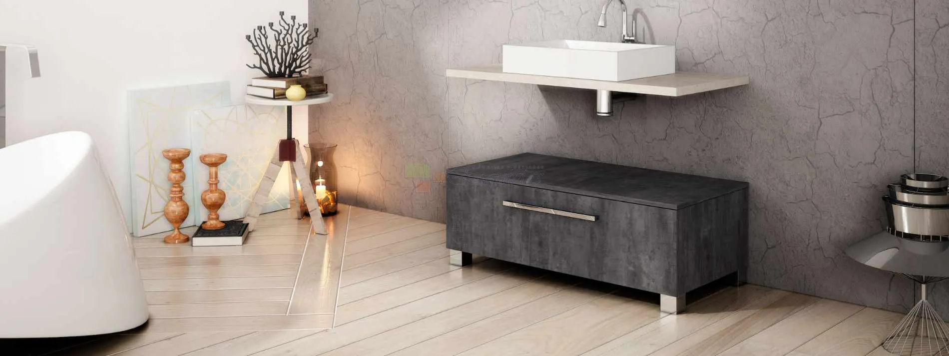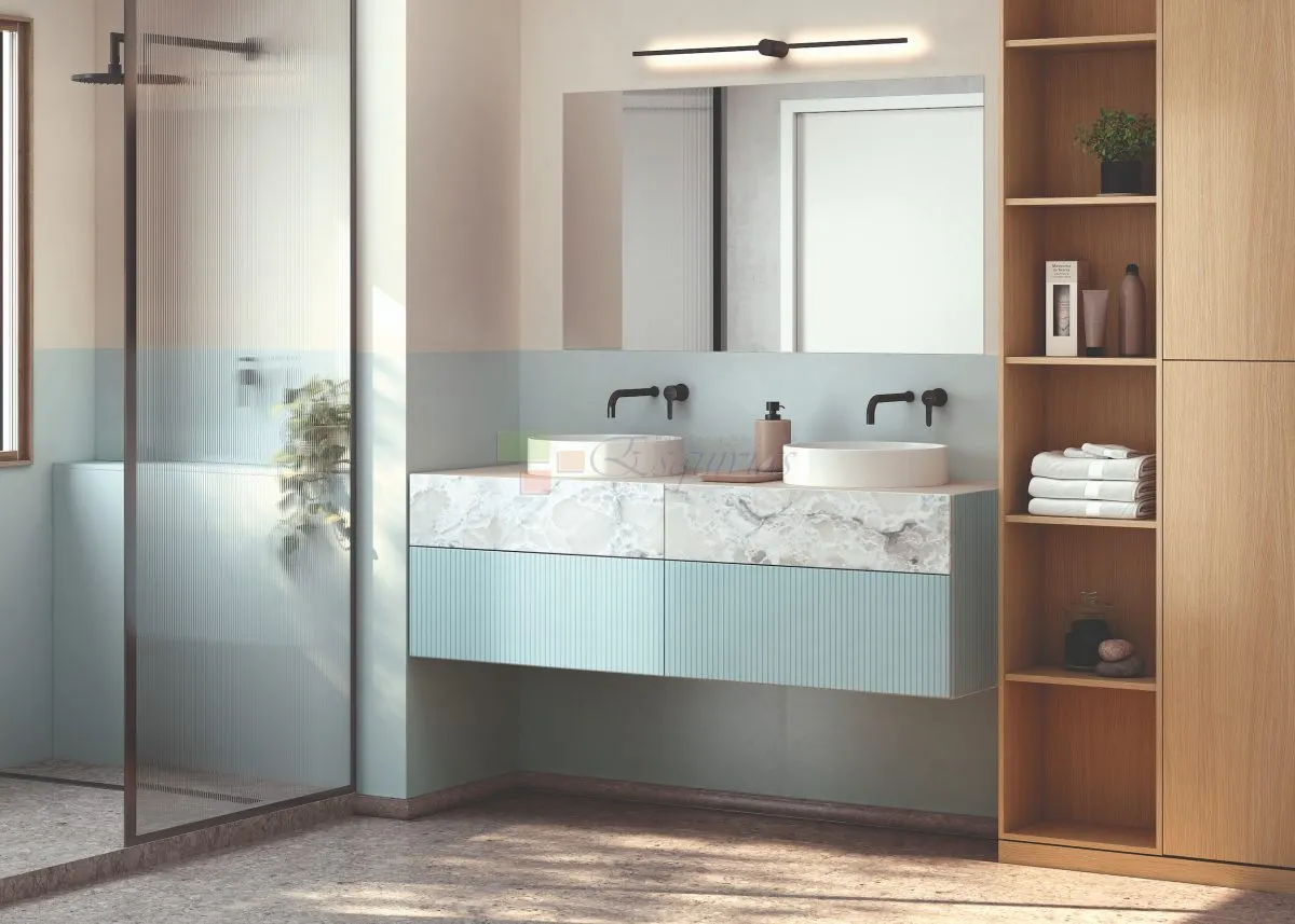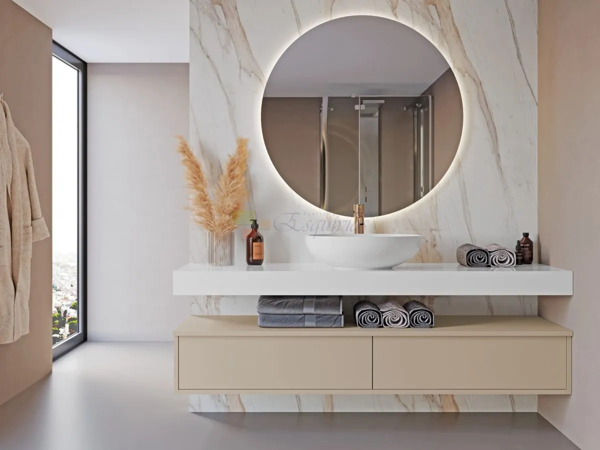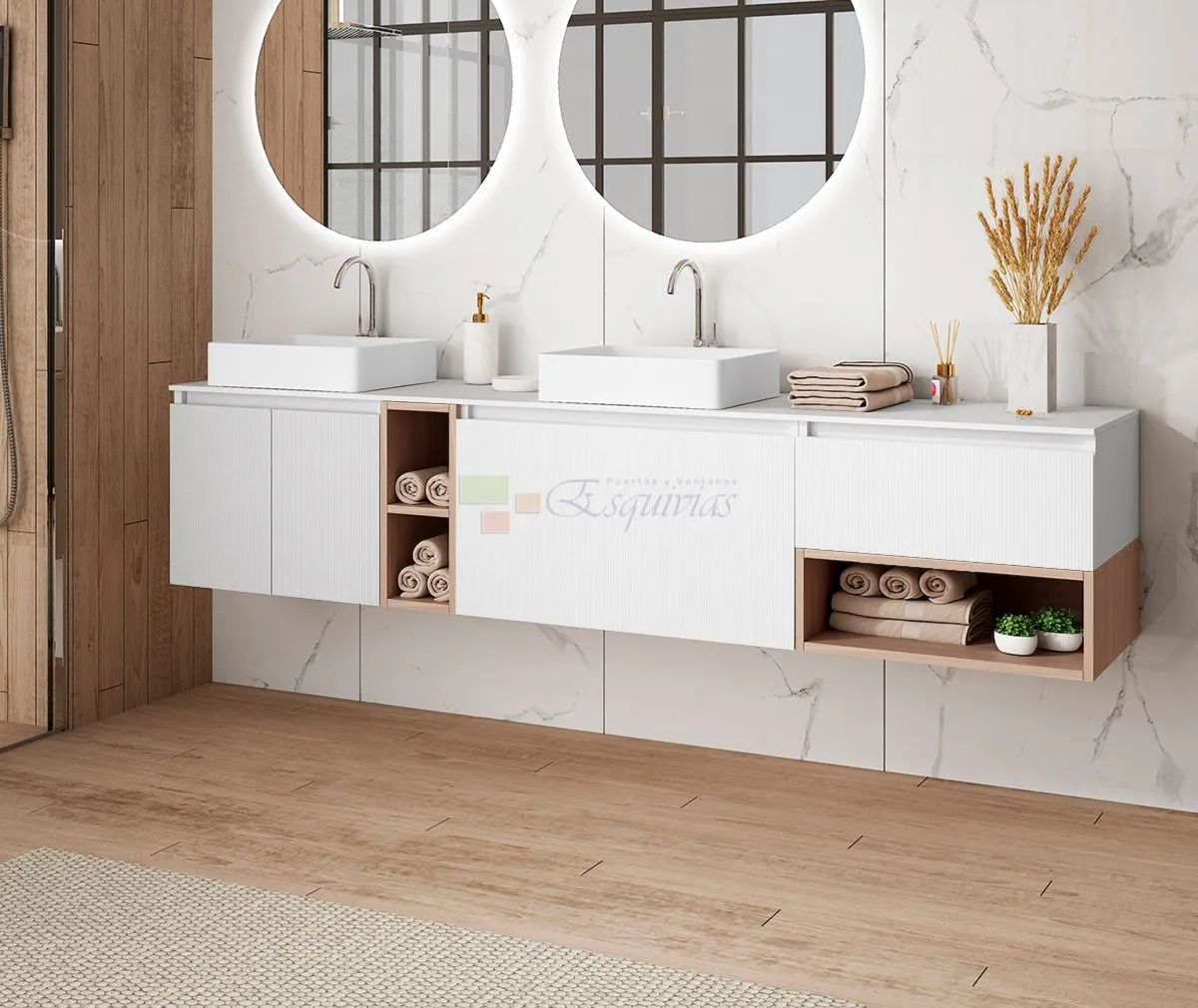 Muebles suspendidos, encimeras, columnas y almacenaje optimizado.